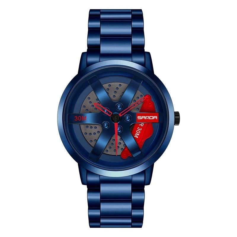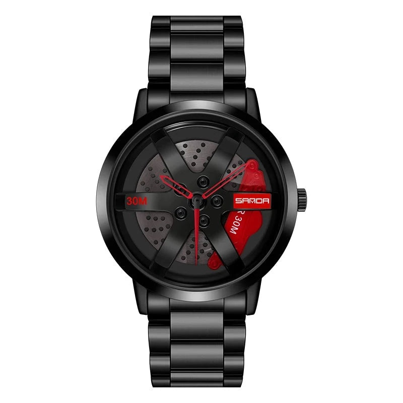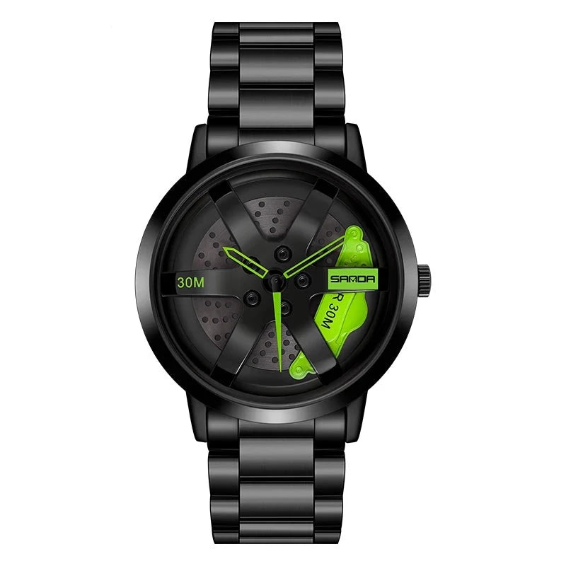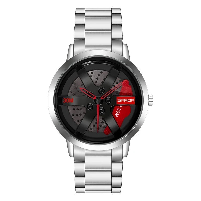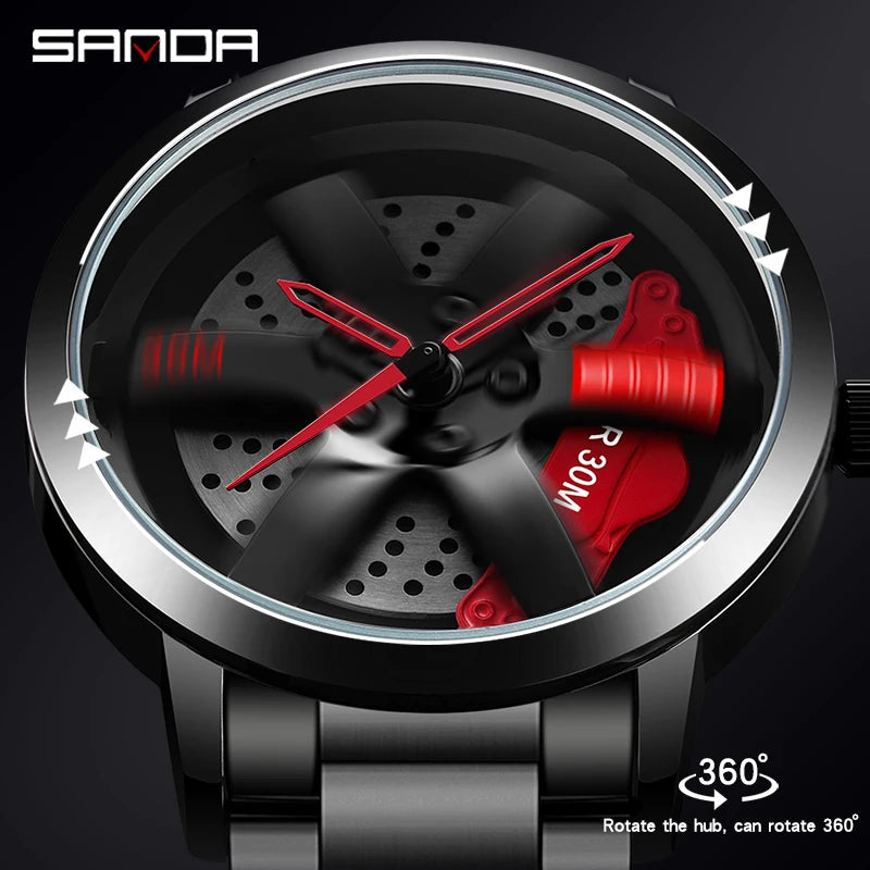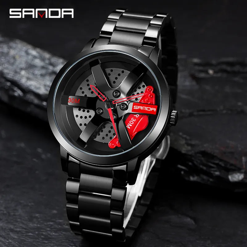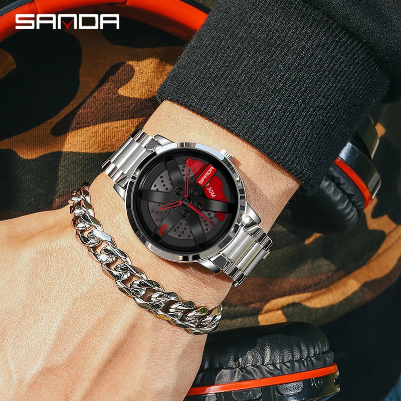 Discover the RimSpin 1075, a marvel of sports watch innovation brought to you by Sanda. This watch is not just a timekeeping instrument, but a conversation piece, with its unique 3D printed car wheel design and a dial that simulates the rotating motion of a wheel at high speed. Perfect for motorsport enthusiasts and lovers of innovative designs.